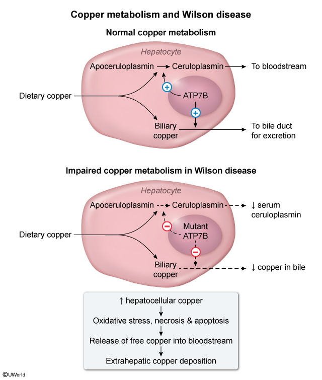 - ATP7B mutation → impaired intracellular hepatocyte copper transport