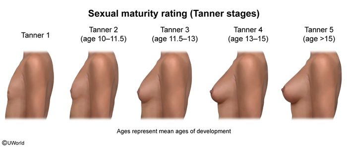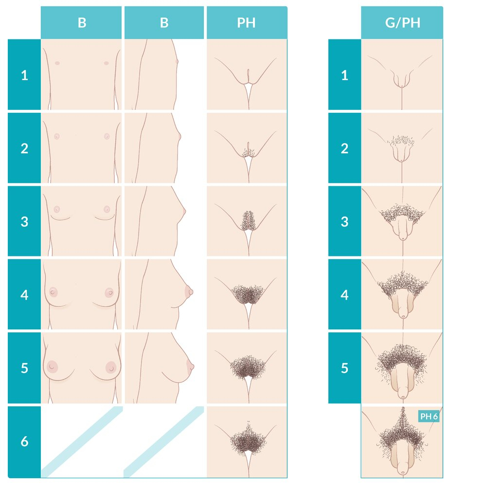 | Stage | Breast Development | Pubic Hair | Age Range |