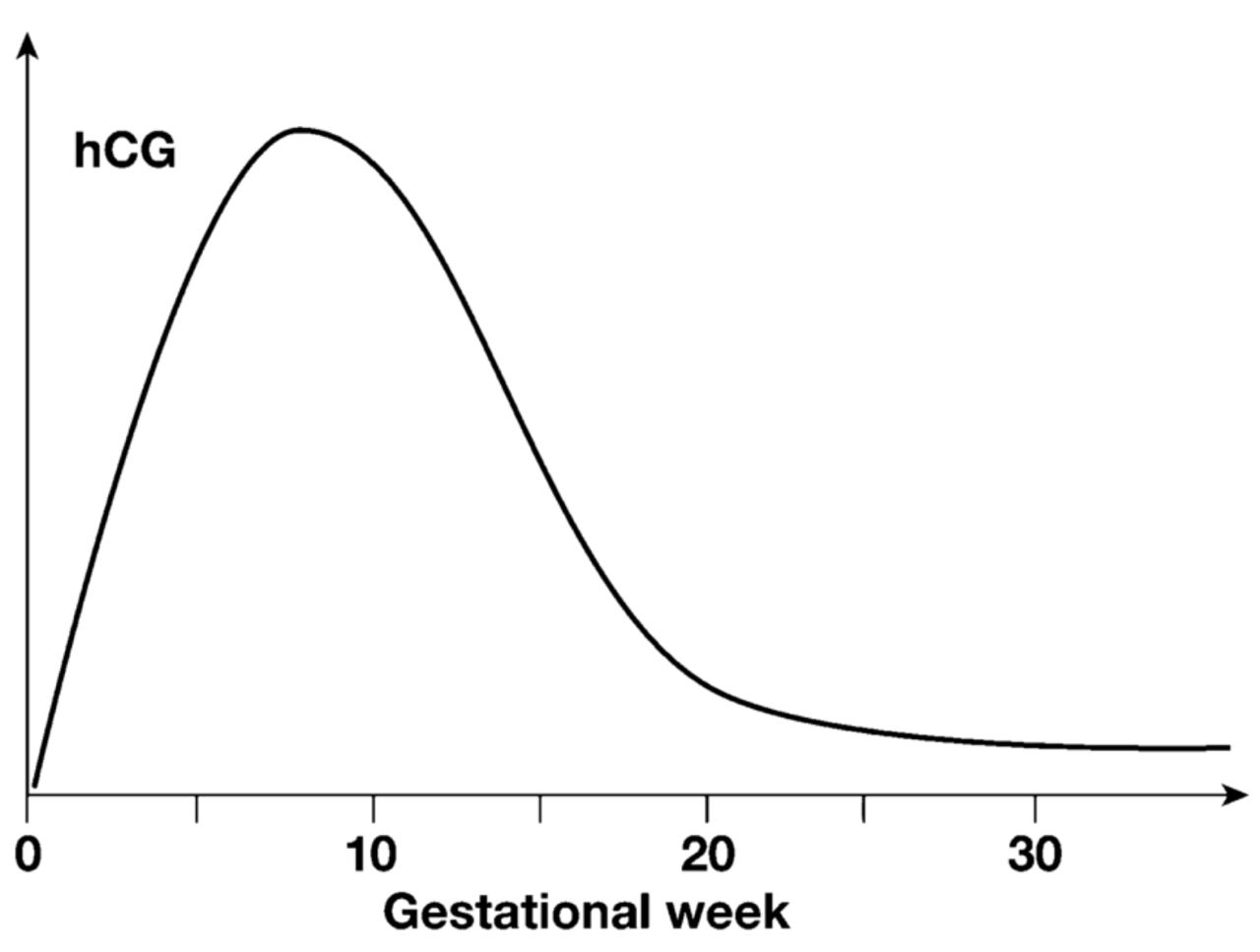 - In the first 30 days following implantation, hCG levels approximately double every 29 to 53 hours, peaking at 8 to 10 weeks of gestation. After reaching the peak, the levels decline but then stabilize until the term. These dynamic changes in hCG concentrations are crucial indicators of the pregnancy's progression and health.