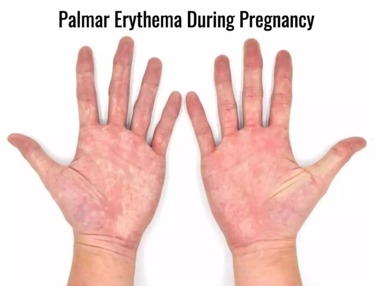 - Telangiectasias and Palmar Erythema: Small blood vessels and redness of the palms, usually in the first 4 weeks.