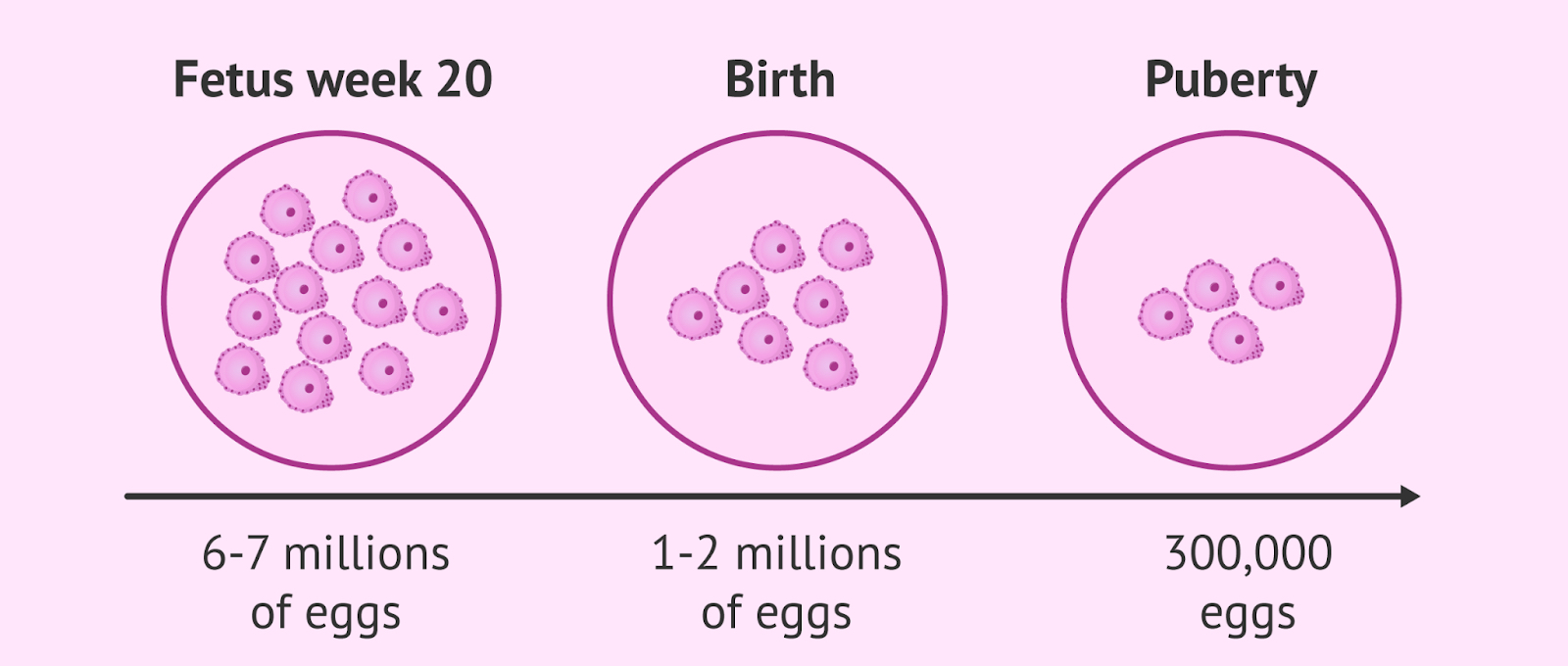 - This process begins in utero, where a female fetus will develop approximately 7 million primary oocytes by 20 weeks of gestation. By birth, the number of primary oocytes drops to about 1–2 million. However, by the onset of puberty, only about 300,000 to 400,000 oocytes remain.