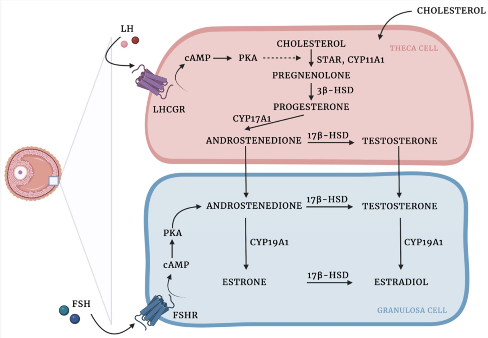 - Luteinizing hormone (LH) receptors, predominantly located on thecal cells in the ovary, stimulate these cells to produce ovarian androgens and steroid precursors. These precursors are then transported to granulosa cells for aromatization into estrogens, essential for maintaining the endometrium.