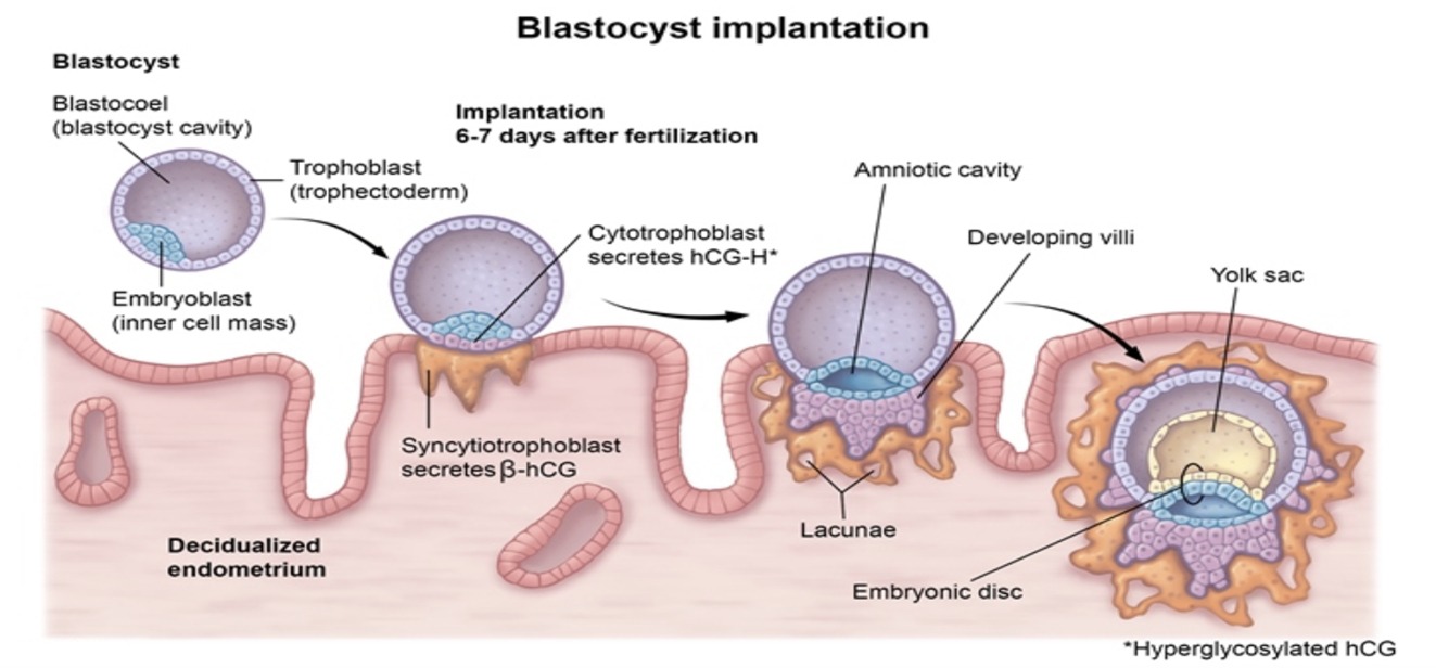 - The blastocyst consists of outer trophoblasts and inner embryoblasts. At this early stage, the trophoblast cells play a crucial role as they begin to produce human chorionic gonadotropin (hCG) shortly after implantation.