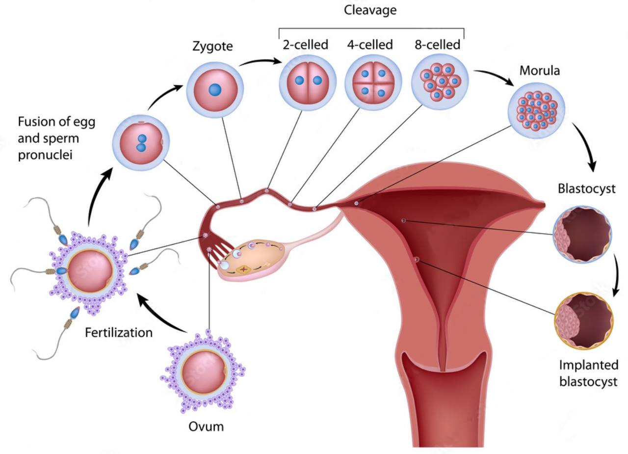 - After fertilization, the zygote divides and travels towards the uterus, transitioning into a morula, which is the 16-cell stage, and then into a blastocyst.