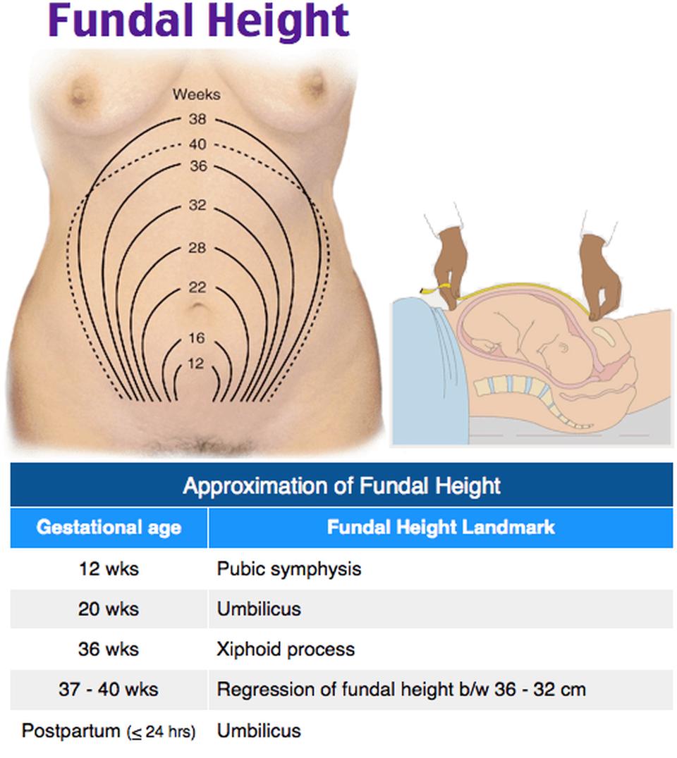 - By 20 weeks' gestation, the fundus is at the level of the umbilicus. Post 20 weeks, the measurement in centimeters from the symphysis pubis to the fundus should approximate the gestational age in weeks.
