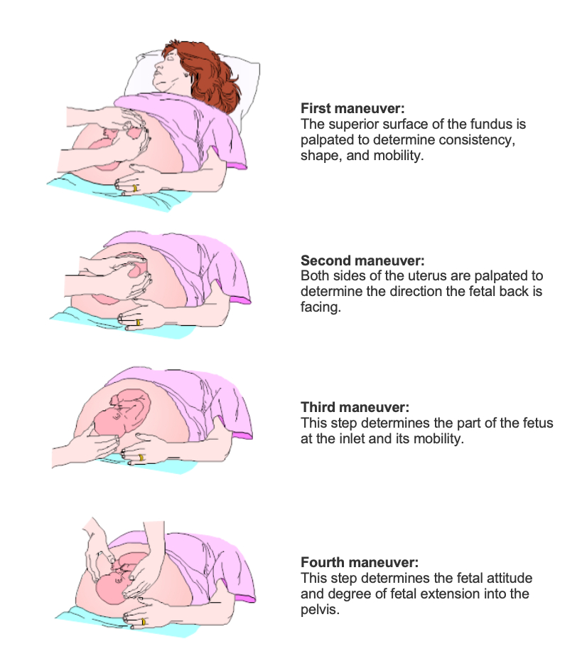 - A series of four palpation techniques used to assess fetal position, presentation, and engagement.