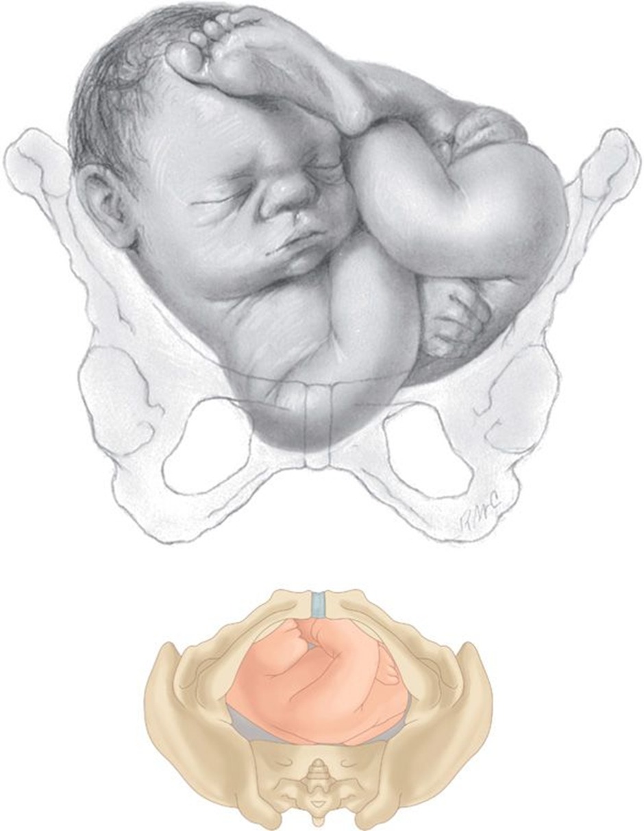 - The baby's occiput (back of the head) is facing towards the maternal symphysis pubis, with the fetus looking downward.