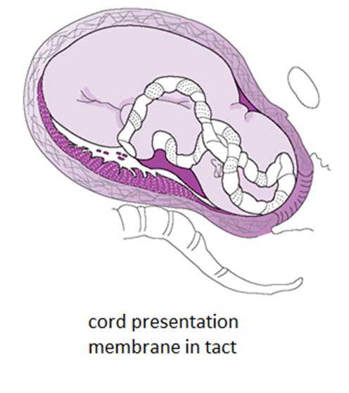 - Cord Presentation: the umbilical cord lies between the fetal presenting part and the cervix, potentially with or without the membranes having ruptured.