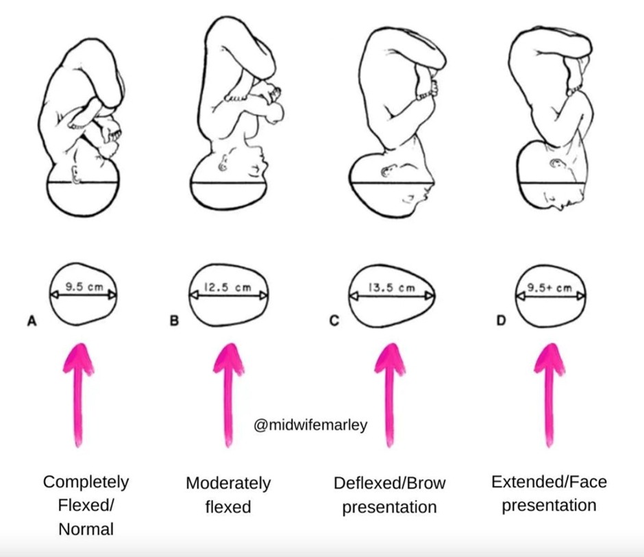 - Hyperextension: tilted back as far as possible, often leading to face presentation with the chin (mentum) being the leading part.