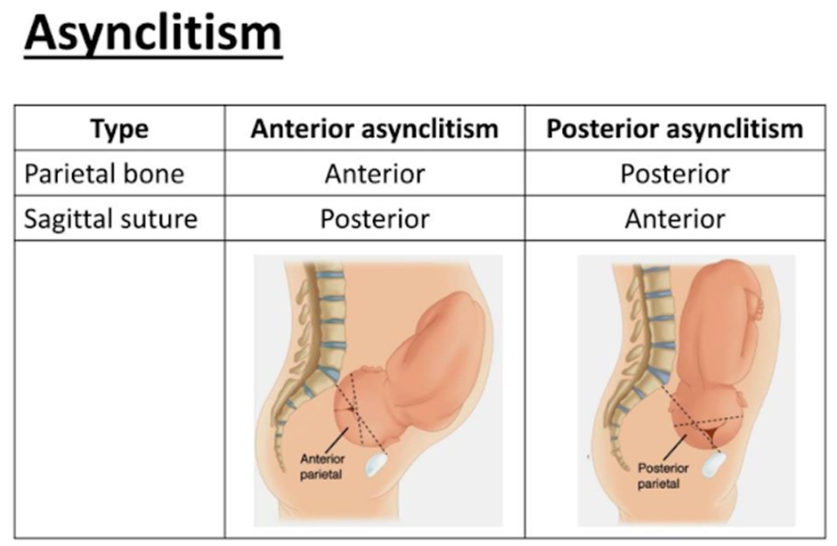 - Asynclitism: deviation from the ideal alignment, leading to challenges during delivery. It is characterized by the tilt of the fetal head, with the sagittal suture off-center relative to the maternal pelvic inlet.