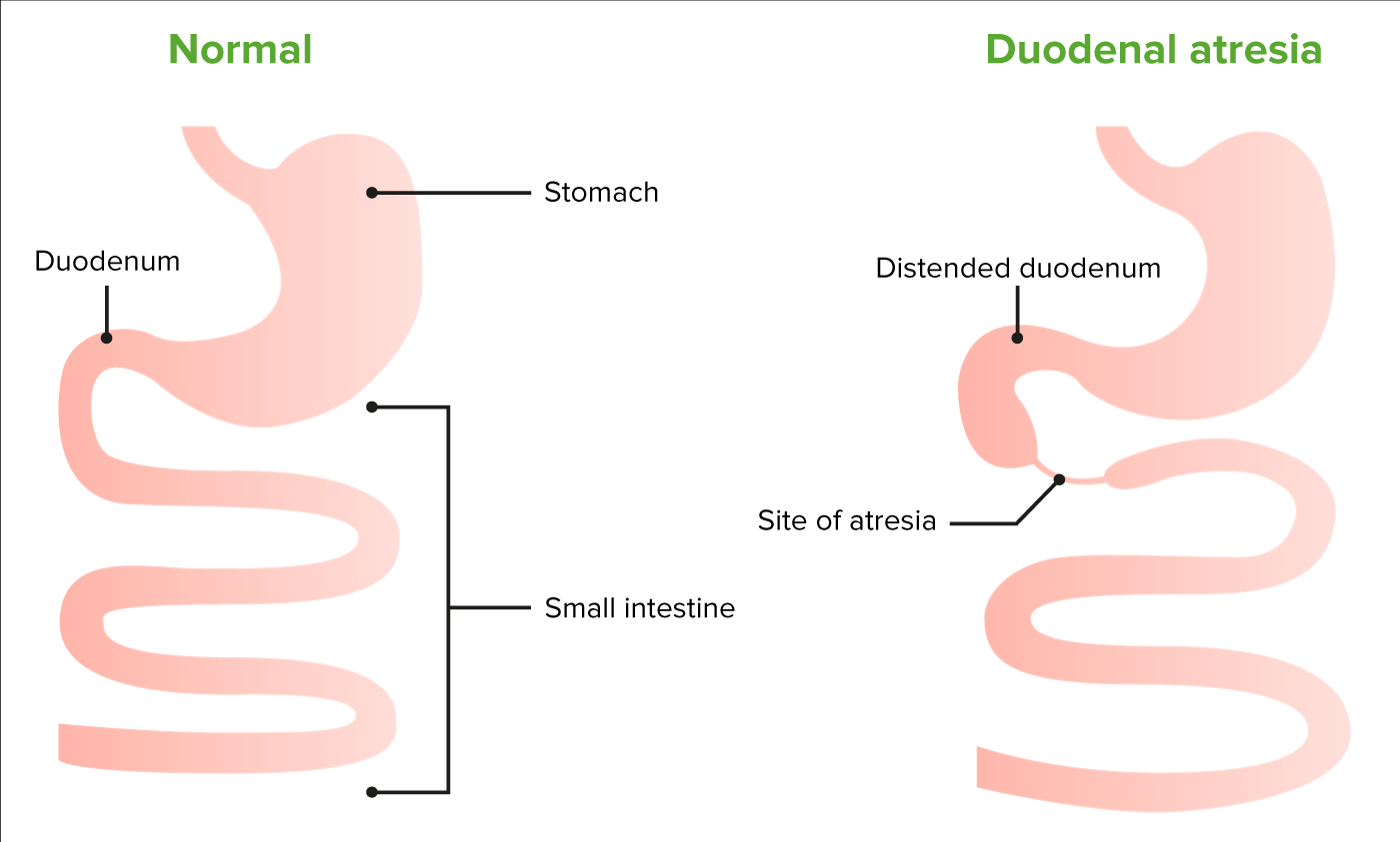 - Duodenal atresia and stenosis is a congenital (mechanical) obstruction of the duodenum caused by failure of the lumen to recanalize at 8-10 weeks gestation (gastric outlet obstruction).