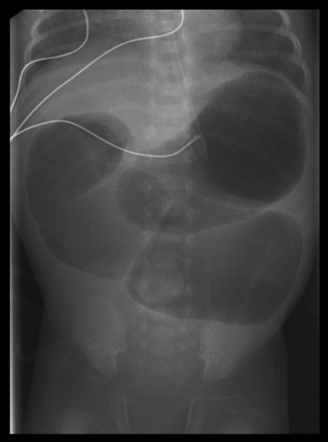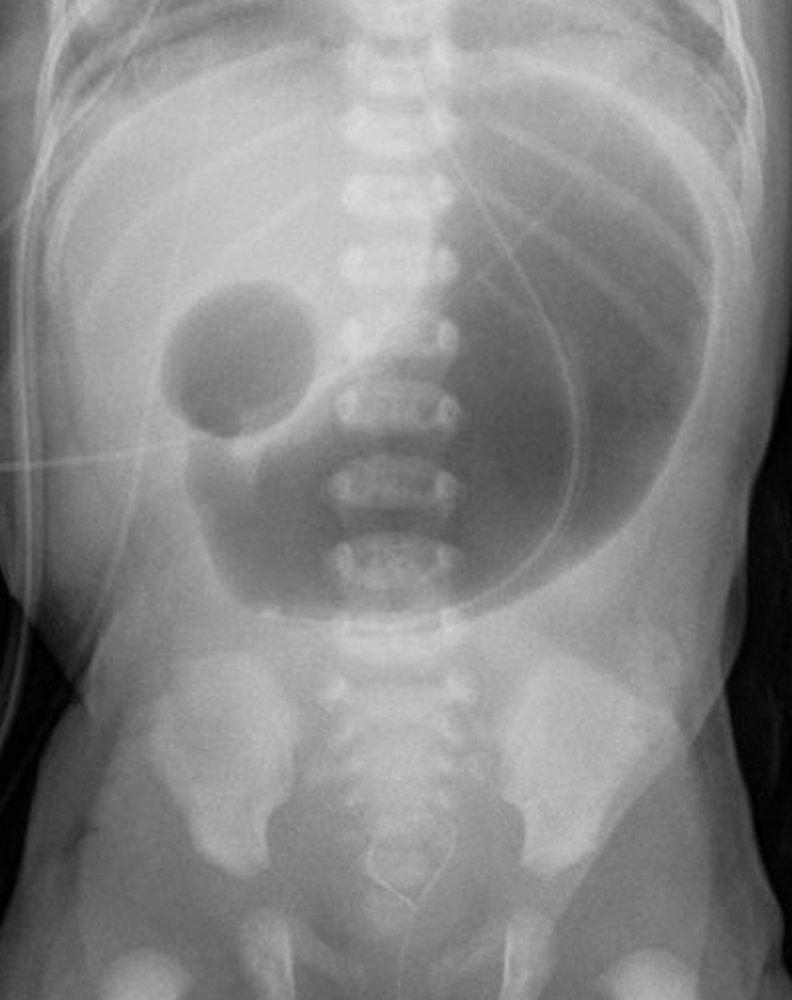 - Abdominal X-ray shows air in the stomach, and proximal duodenum (double-bubble sign) with no distal bowel gas.