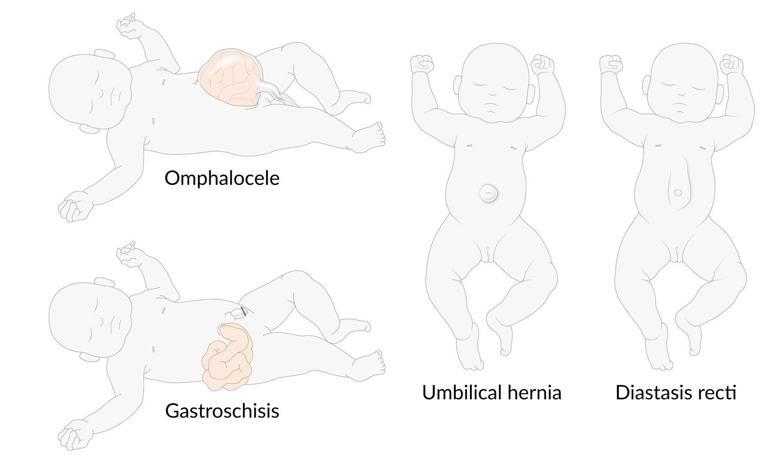 - Omphalocele: a midline defect covered by a sac, often associated with other congenital syndromes.