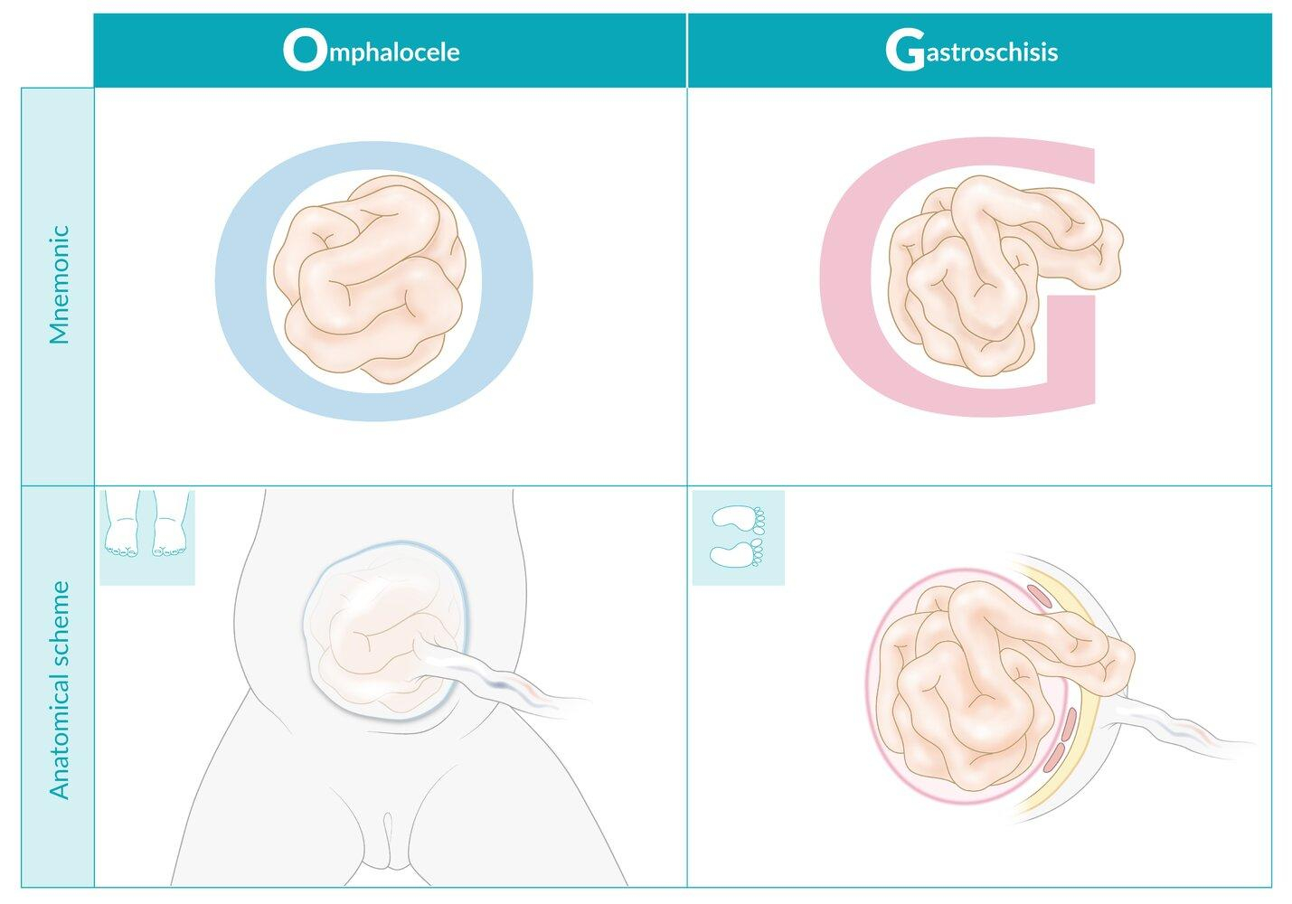 - Gastroschisis: an open defect typically to the right of the umbilicus, with exposed intestines lacking a protective membrane.