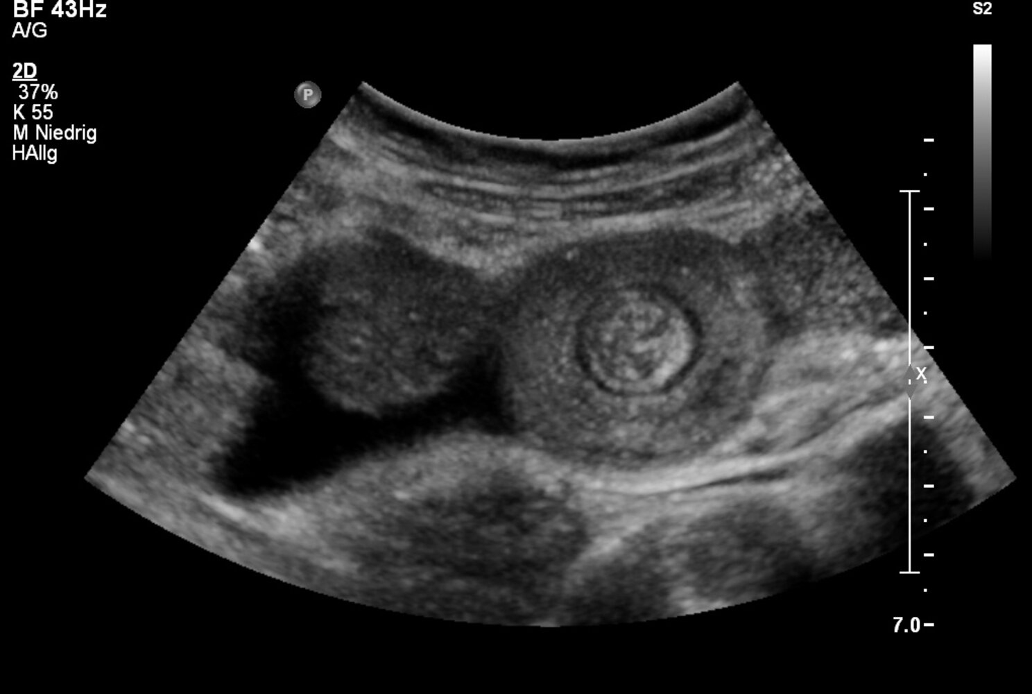 - Sausage-shaped mass may be palpated in the abdominal right upper quadrant.