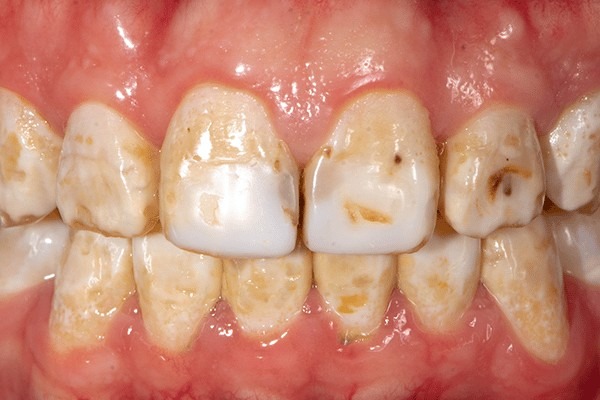 - Excess fluoride intake can lead to: Dental fluorosis : a cosmetically disfiguring condition resulting in the enamel having white flecks, opaque white appearance, or brown discoloration (>4-8 mg/day) during the teeth-developing years.