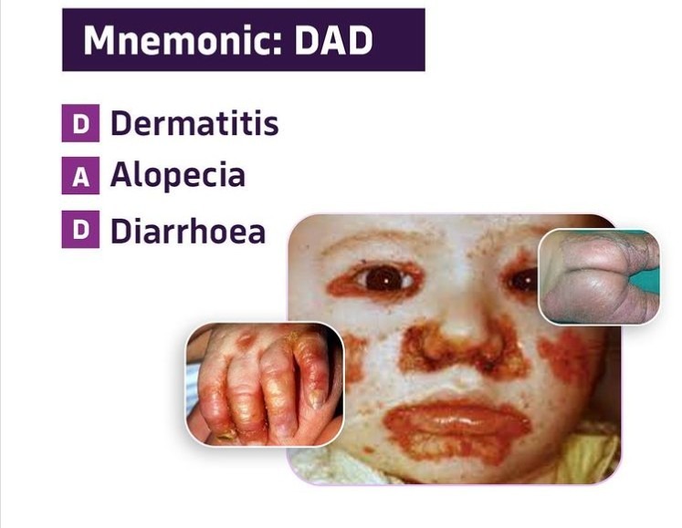 *DAD: triad of: dermatitis ( face,hands, and perianal area),alopecia, and diarrhea.