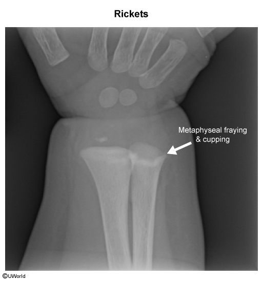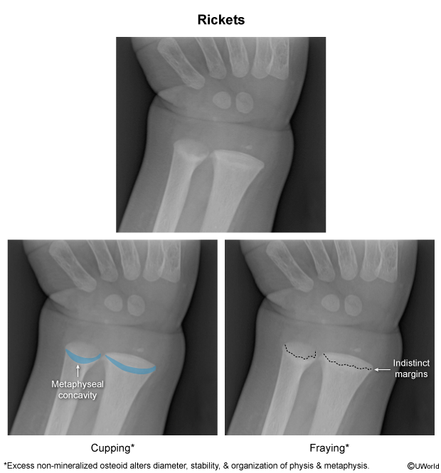 - Frayed and cupped metaphyseal ends (irregular and blurred bone ends).