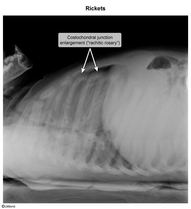 - Rachitic rosary (enlargement of the costochondral joints of the ribs).
