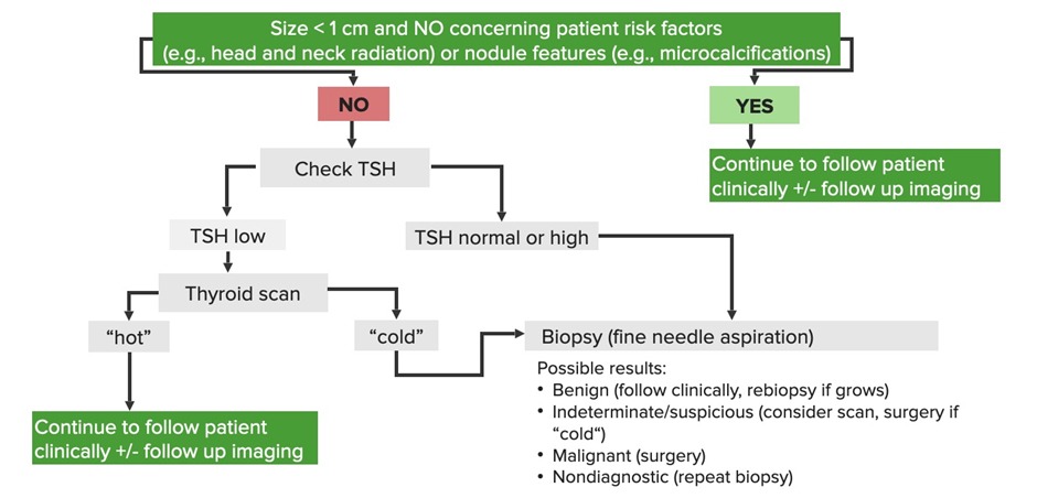 - TSH levels (low TSH levels are more concerning for malignancy)