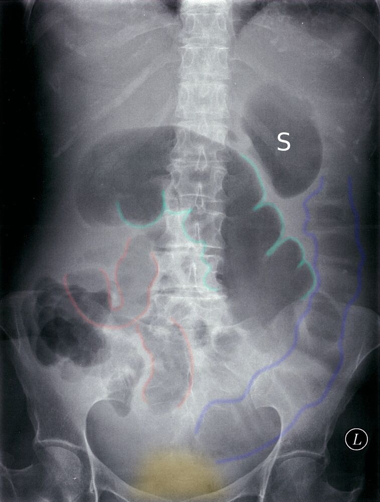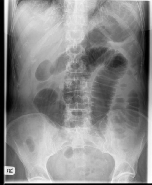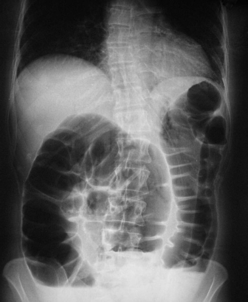 - Distended proximal colon and cecum on abdominal X-ray