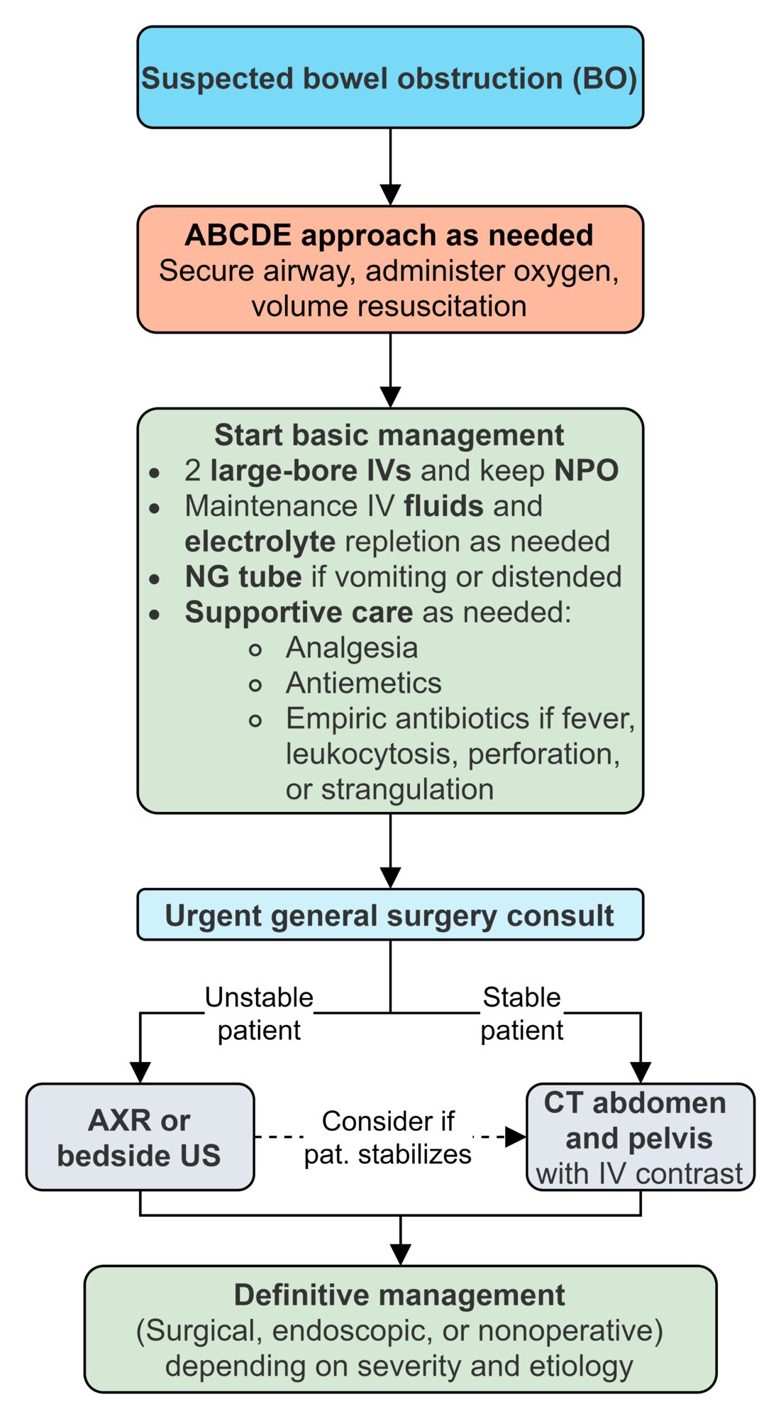 Management includes supportive care (IV fluids, nasogastric decompression) with nonoperative approach for simple obstructions. Surgical intervention is indicated for complicated cases (showing strangulation, ischemia), closed-loop obstructions, or when conservative management fails after 72 hours. Complications include bowel ischemia, perforation, and peritonitis.