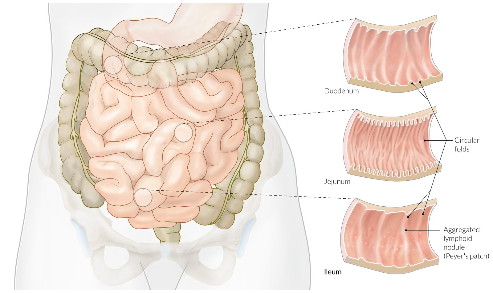 | In the wall | Tumors, strictures (Crohn's disease), congenital atresia, diverticulitis |
