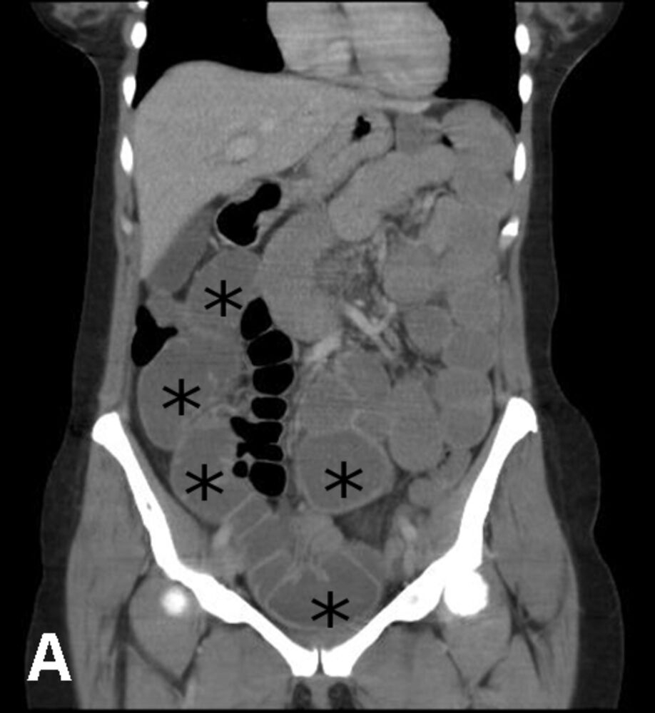 - Acute appendicitis (imaging would reveal an enlarged appendix with signs of inflammation instead of dilated loops of bowel)
