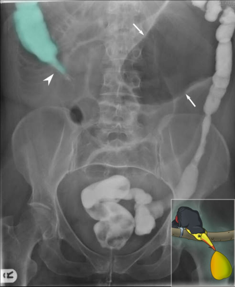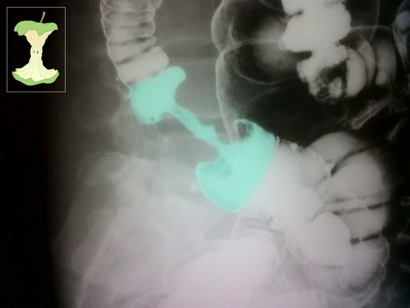 - Contrast radiography with enema (bird’s beak appearance in volvulus, Apple core sign in colonic malignancy)