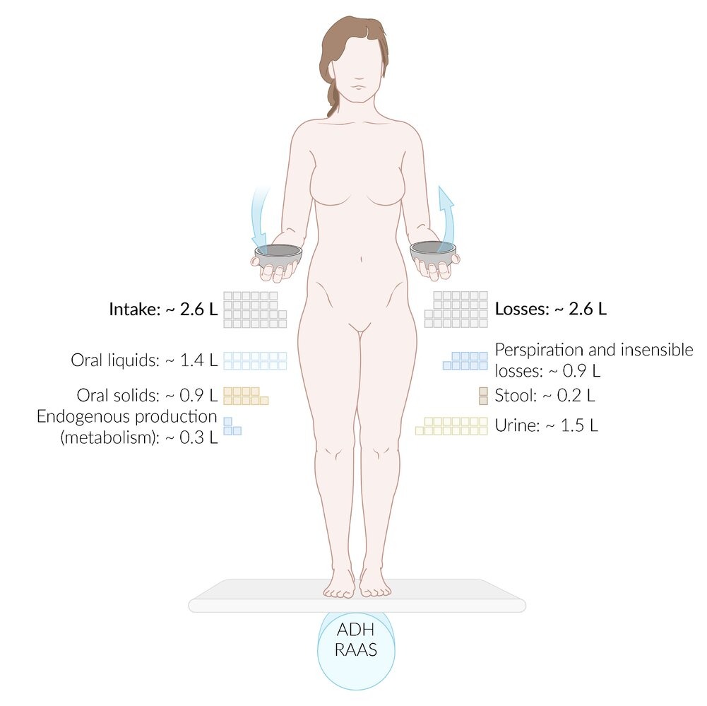 - Fluid enters and leaves the body through different routes that yield a certain amount (divided into sensible losses that can be seen, felt, and measured and insensible losses)