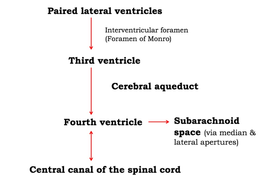 - Direction of flow: CSF flows from the lateral ventricles through the foramen of Monro into the third ventricle, via the aqueduct of Sylvius into the fourth ventricle and then through the foramina of Magendie (1 foramen) and Luschka (2 foramina) into the subarachnoid space and basal cisterns