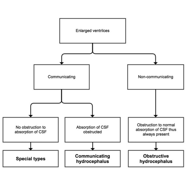 - Communicating hydrocephalus (there’s no obstruction to the flow of CSF flow within the ventricular system; usually failure of absorption of CSF by the arachnoid granulations)
