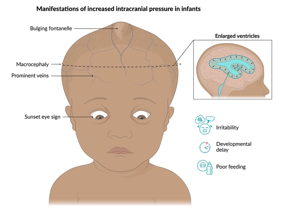 - Prior to the fusion of cranial sutures, infants most commonly present subacutely with increasing head circumference. Children typically become irritable before progressing to vomiting or restricted upgaze